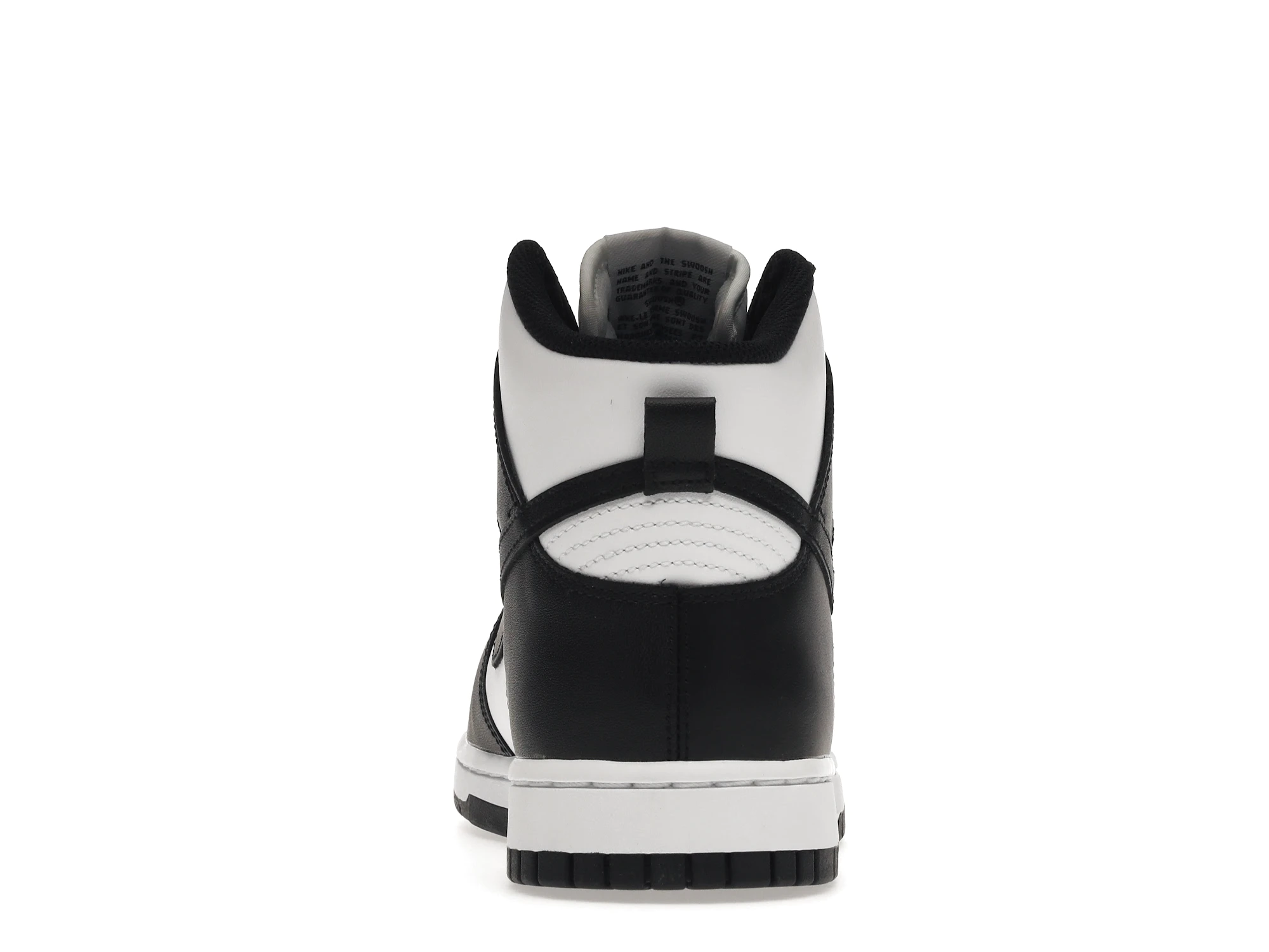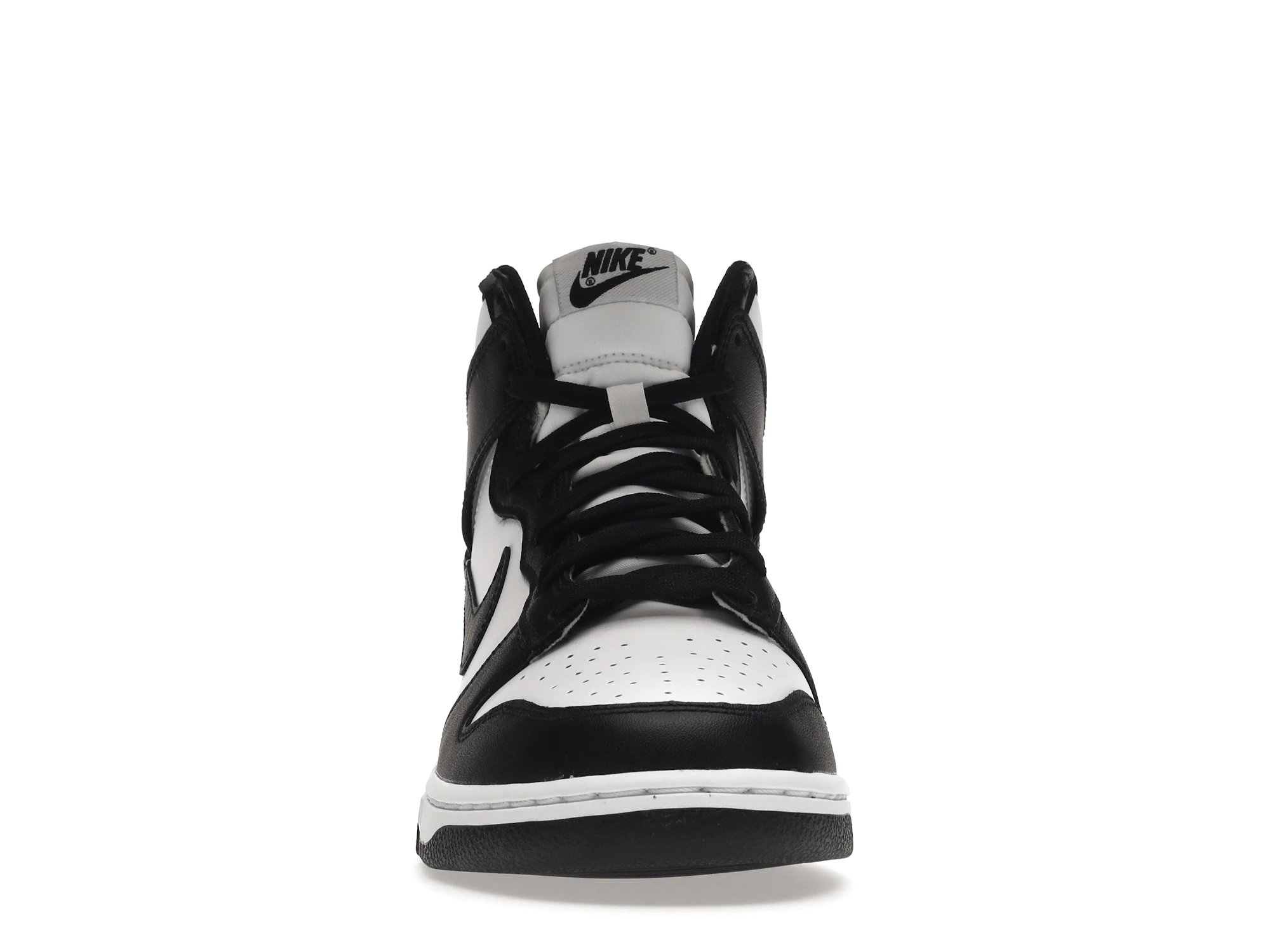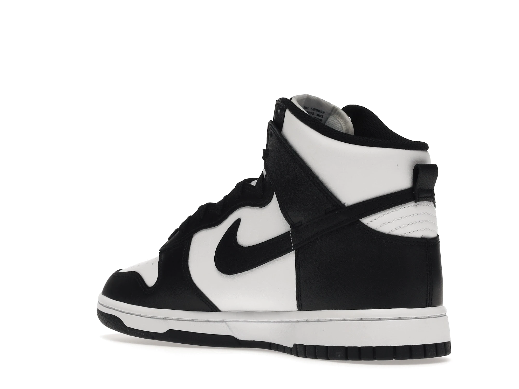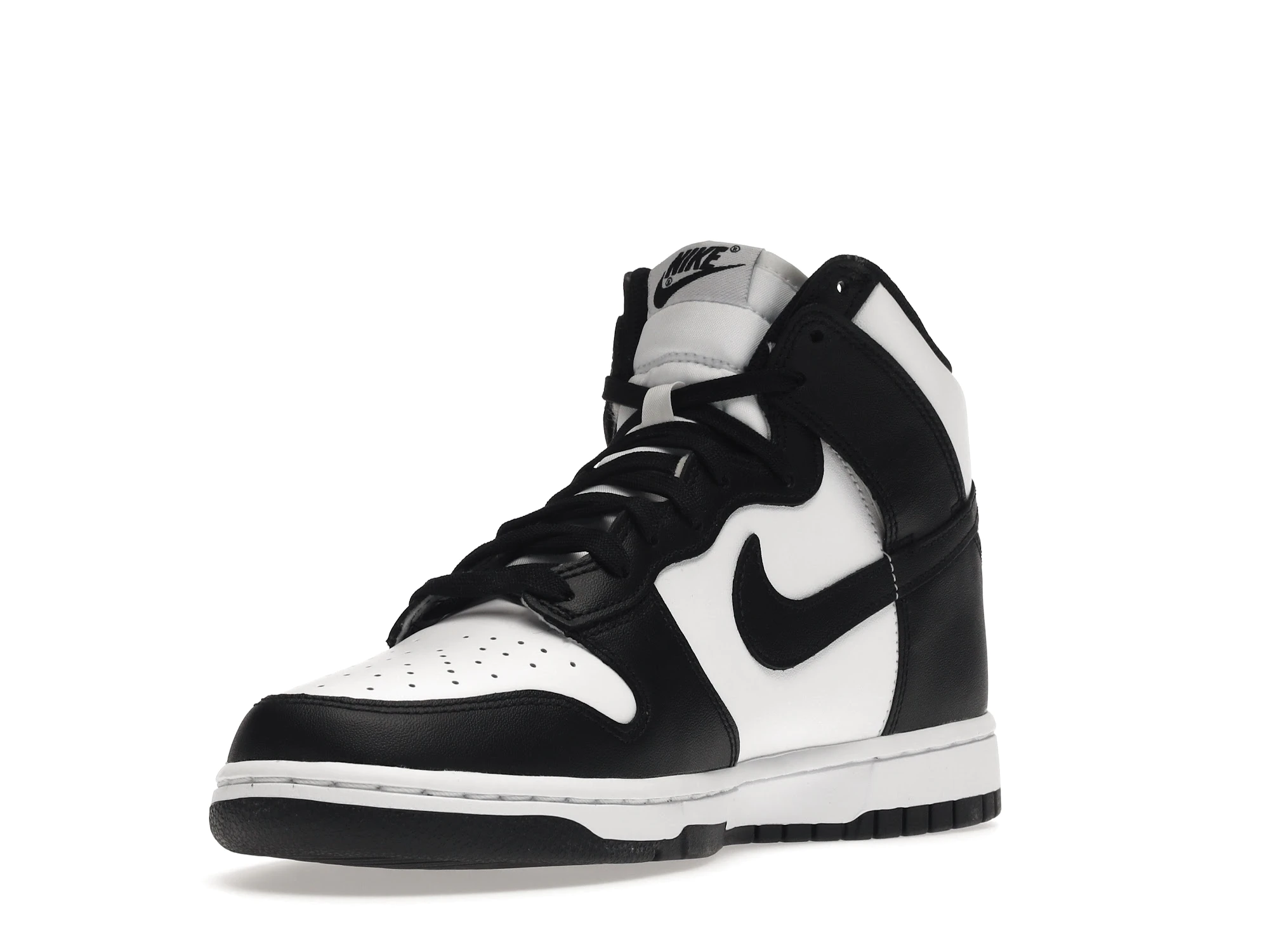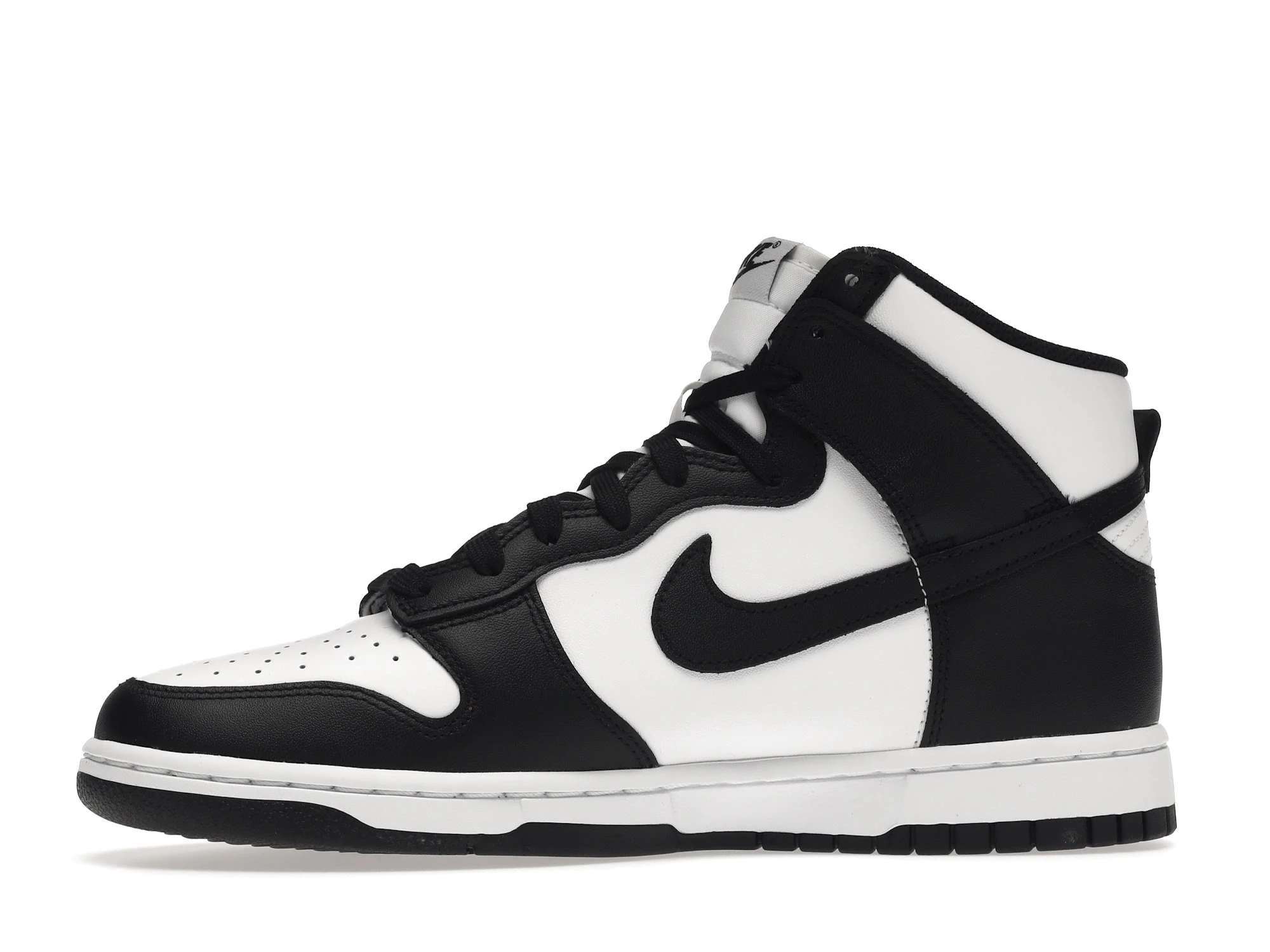 mooth black and white full-grain leather make up the entire upper of the Nike Dunk High Panda (2021). A black outsole and white midsole continue the Panda motif while a University Red Nike Air Swoosh logo is embroidered on the tongue tag to add a pop of color.