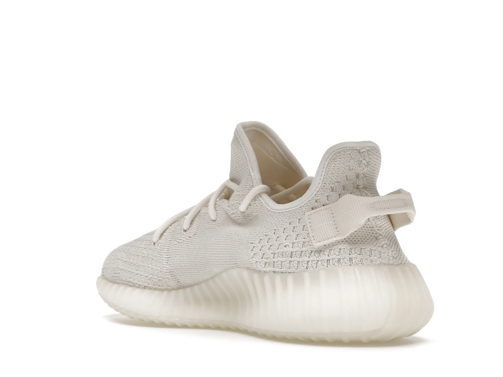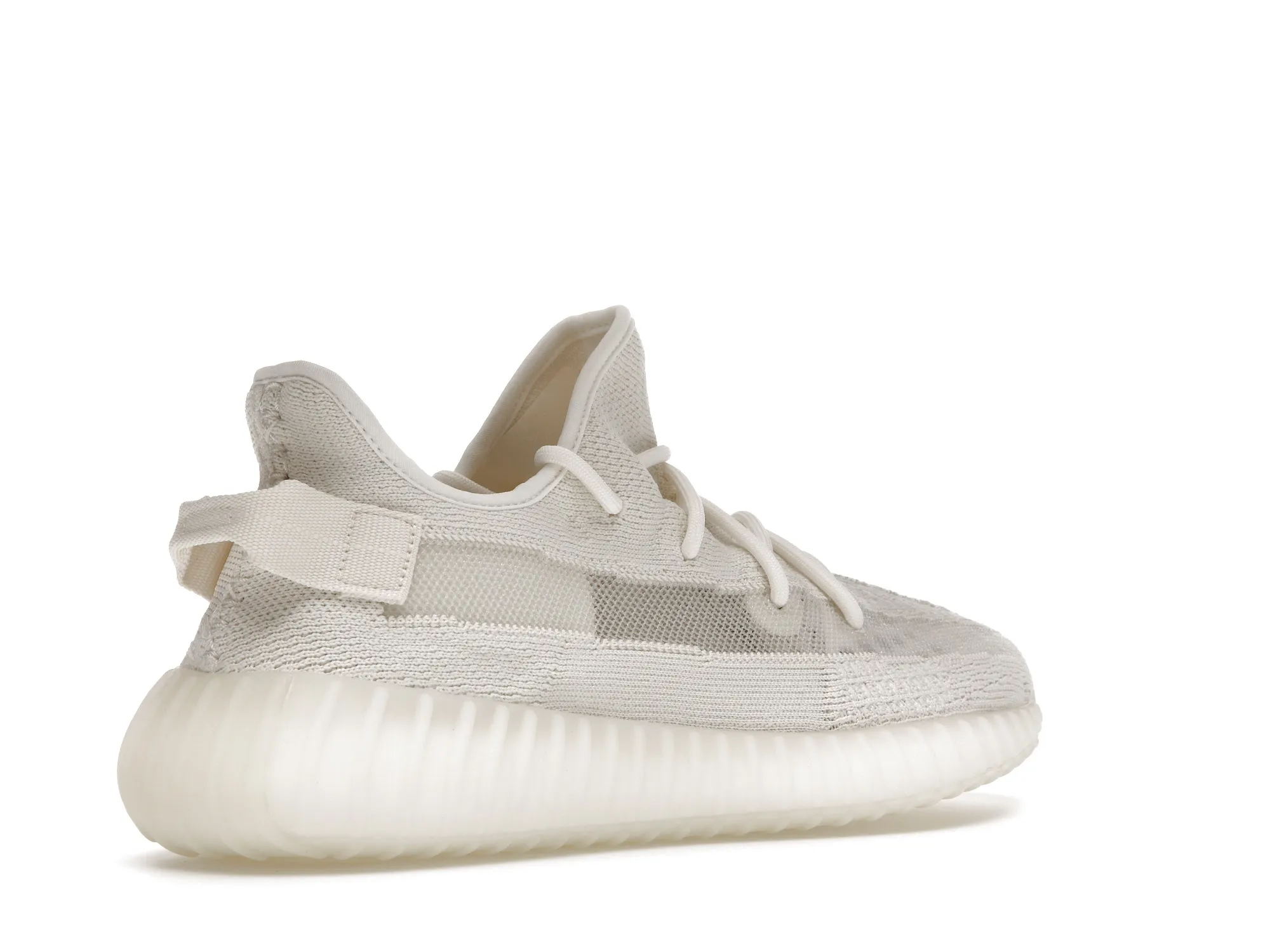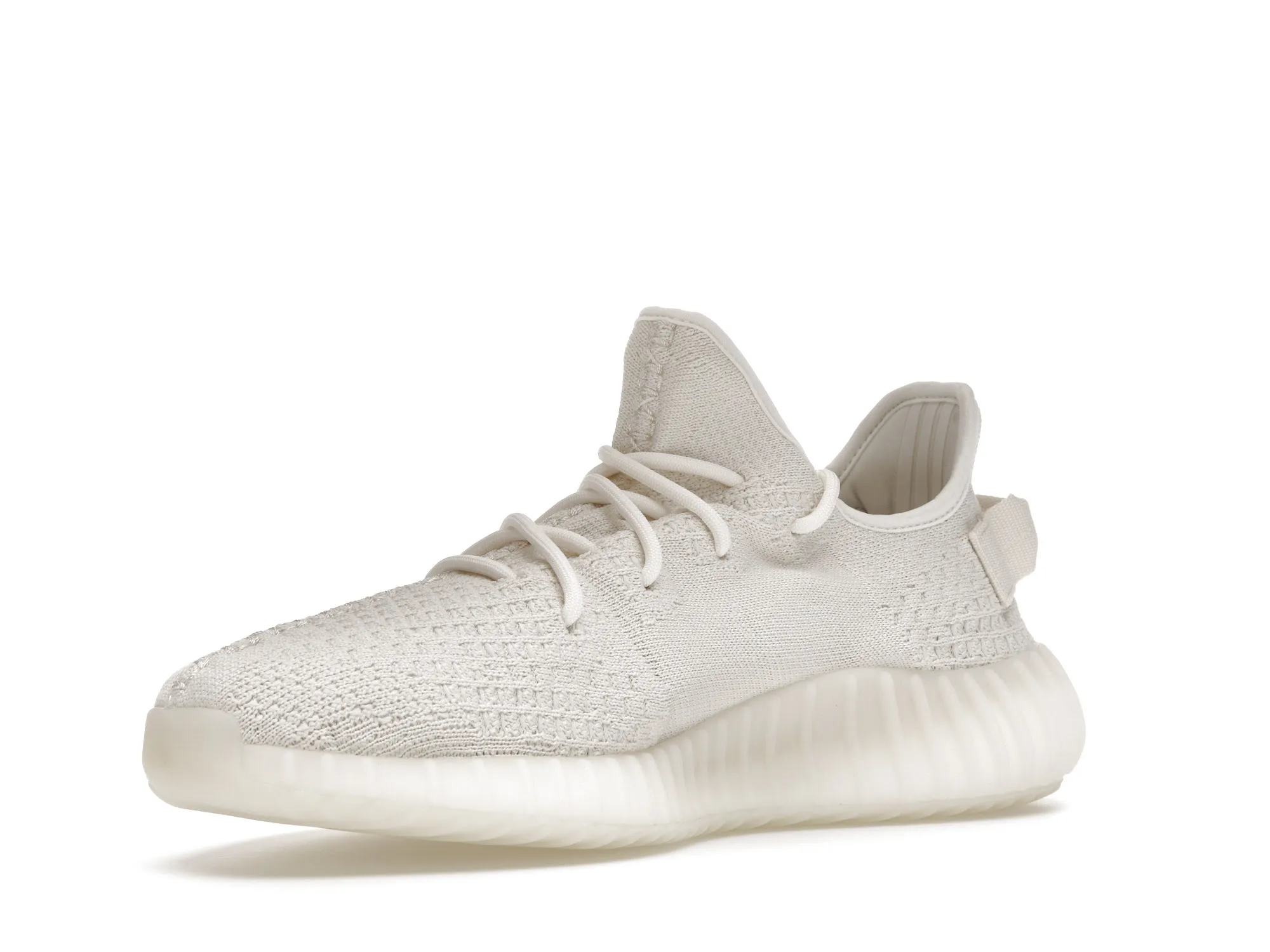 The adidas Yeezy Boost 350 V2 Bone features a triple white Primeknit upper with mesh side stripes and canvas heel tabs. At the base, a semi-translucent sole with Boost technology completes the design.